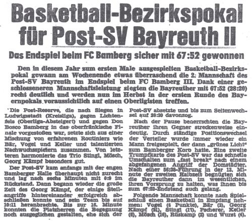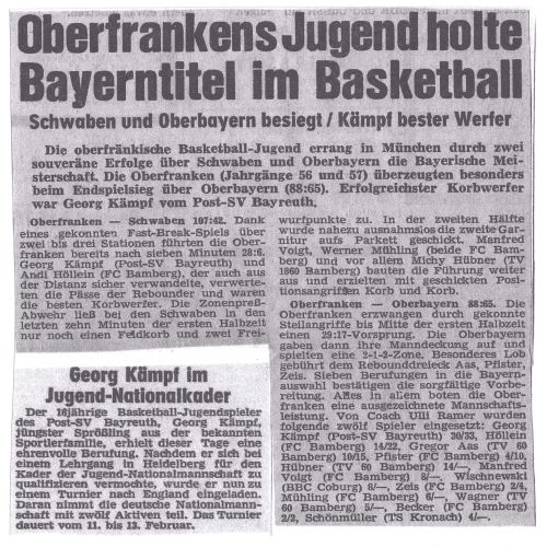 Auf zwei "Highlights" für den Basketballbezirk Oberfranken verweisen noch zwei Zeitungsartikel aus dem Archiv von Horst Link: Die oberfränkische Jugendauswahl errang den Bayerntitel und der 16jährige Georg Kämpf (Post SV Bayreuth) erhielt im Februar 1972 eine Einladung zur deutschen Jugendnationalmannschaft.