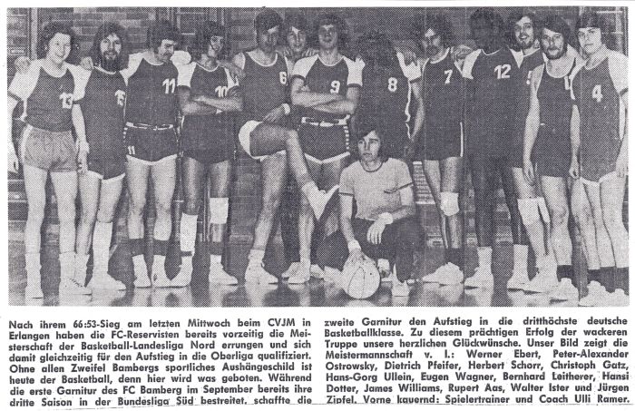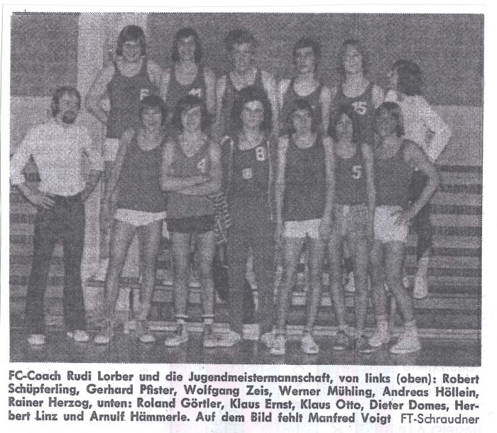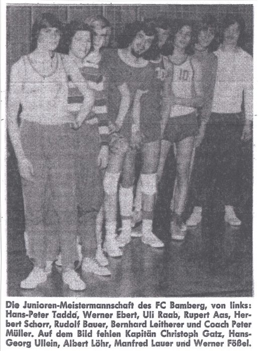 Die oberfränkische Dominanz in Nordbayern zeigte sich auch bei der Meisterschaft, die in Bamberg statt fand. Die jüngsten FC - Basketballer (Jahrgänge 1958 und jünger) sicherten sich in ihrer ersten Saison den Titel vor den Würzburger Kickers (Meister Unterfrankens) und dem mittelfränkischen Meister TSV Ansbach. In der Begegnung gegen die Würzburger sah es bis zur Halbzeit (Rückstand 8:10) noch nicht so gut aus. Erst als in den restlichen zwei Vierteln die Aufbauspieler Gerner, Späth und Tadda ihre Nervosität ablegten, gelang der wichtige 33:23 Erfolg. Den körperlich unterlegenen Schülern aus Ansbach glückte im zweiten Spiel erst beim Stand von 32:0 ihr erster Korberfolg. In dieser Begegnung wussten nun auch die Center Rock, Glas, Mahr und Hempfling zu überzeugen. In den letzten beiden Vierteln wurde der Vorsprung über gut vorgetragene Schnellangriffe vor allem durch Gerner und Görtler zum Endstand von 67:12 ausgebaut.