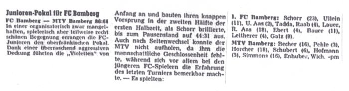 Die Finalteilnehmer zur Bayerischen Meisterschaft wurden zwischen den beiden Erstplatzierten der Nord- und Südbayerischen Meisterschaft ermittelt. Dabei traf der MTV Bamberg als Meister Nordbayerns auf den Südzweiten USC München. In München unterlagen die MTV Junioren knapp mit 63:64 und schufen sich eine gute Ausgangsbasis für das Rückspiel. Zu Spielbeginn sah es für den MTV bei einem 8:20 Rückstand nicht gut aus. Ein Zwischenspurt, für den vor allem Becher und Simmons Verantwortung trugen, erbrachte zur Halbzeit eine 30:27 Führung für den MTV. In der zweiten Hälfte wechselte die Führung ständig und die Bamberger vergaben den möglichen Sieg, da sie zu selten ihre Center ins Spiel brachten.