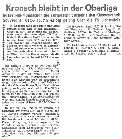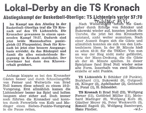 Vor dem Lokalderby in Lichtenfels hatte der Neuling nach dem überzeugenden Heimerfolg über DJK Würzburg (97:82) und einem Remis beim USC München II (60:60) mit 12:20 Punkten sogar die Kronacher (10:20) in der Tabelle überholt. Für Lichtenfels rächte sich nun die späte Ansetzung des Wiederholungsspiels vom 5. Spieltag. Der US-Amerikaner Stinson stand nicht mehr zur Verfügung und bedingt durch Krankheit bzw. Operation (Burmann) fielen weitere Leistungsträger aus. So sicherte sich die TS Kronach in Lichtenfels (70:57) und im Heimspiel (81:53) den Klassenerhalt. Brad Noll (TS Kronach) wurde mit 410 erzielten Punkten bester Korbjäger der Oberliga Bayern.