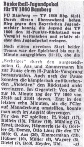 Gleichzeit schlug der 1. FC Bamberg den südbayerischen Meister 1860 München in heimischer Halle mit 86:75. Nachdem in den ersten Spielminuten die Führung ständig wechselte, brachte Gatz durch sein umsichtiges Aufbauspiel und der starke Center Leitherer die Violetten bis zur 14. Spielminute mit 30:16 in Führung. Zur Halbzeit betrug die Bamberger Führung 42:29. Nach dem Wechsel erwischten die Löwen erneut den besseren Start und holten bis zum 46:41 (25. Min.) auf. Doch fingen sich die Gastgeber. Diesmal ragte Aas mit schönen Korberfolgen heraus und bis zur 30. Spielminute betrug die Führung 14 Punkte (60:46). Große Lücken in der Abwehr ermöglichten den Gästen den Vorsprung noch auf 11 Punkte zu reduzieren.